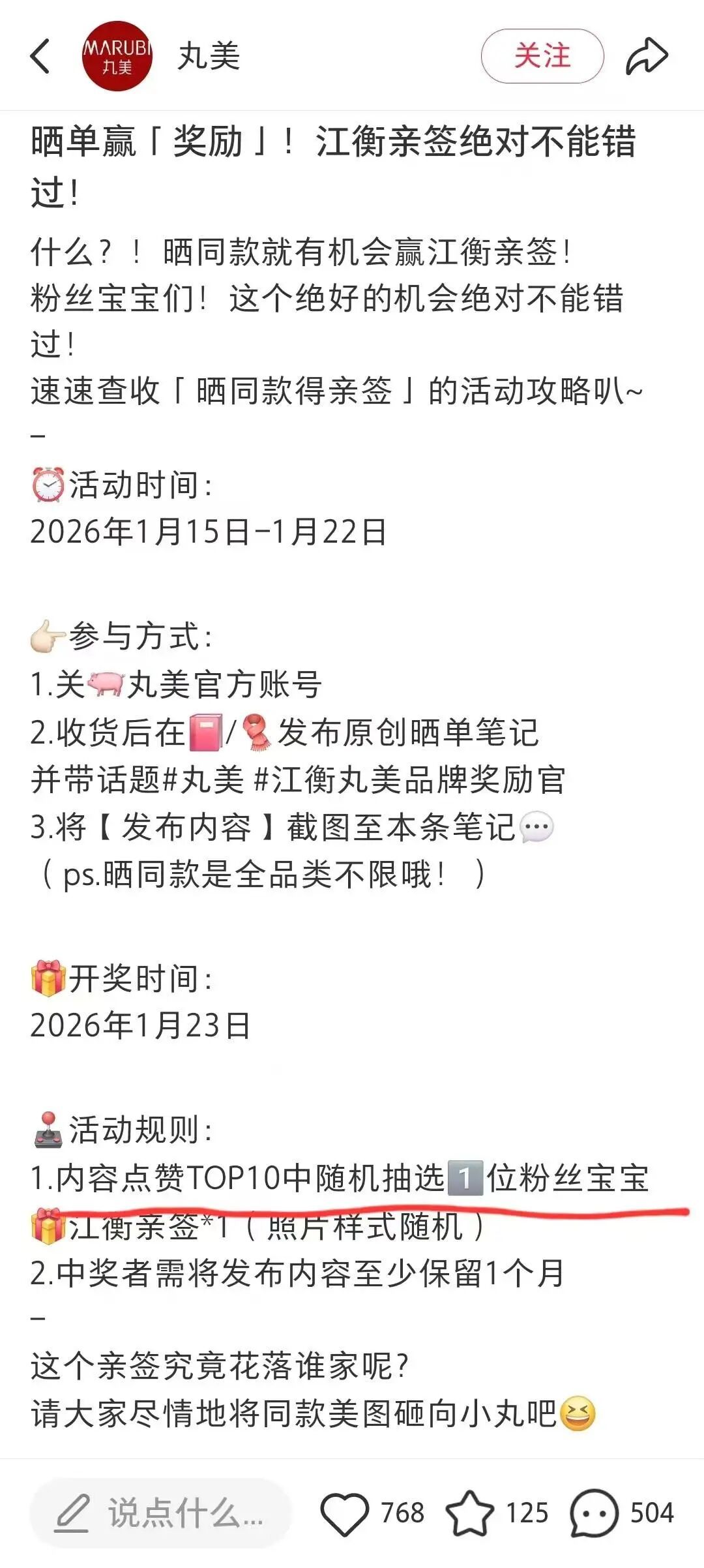 她告诉南都记者,1月15日,丸美官方账号在社交平台发起“晒单赢明星亲签(即亲笔签名照片)”的活动。活动页面发布的活动规则之一是“内容点赞TOP10中随机抽选1位粉丝宝宝”获得亲签,参与方式包括了要在收货后发布原创晒单笔记并带话题,然后将“发布内容”截图至该活动页面的评论区。