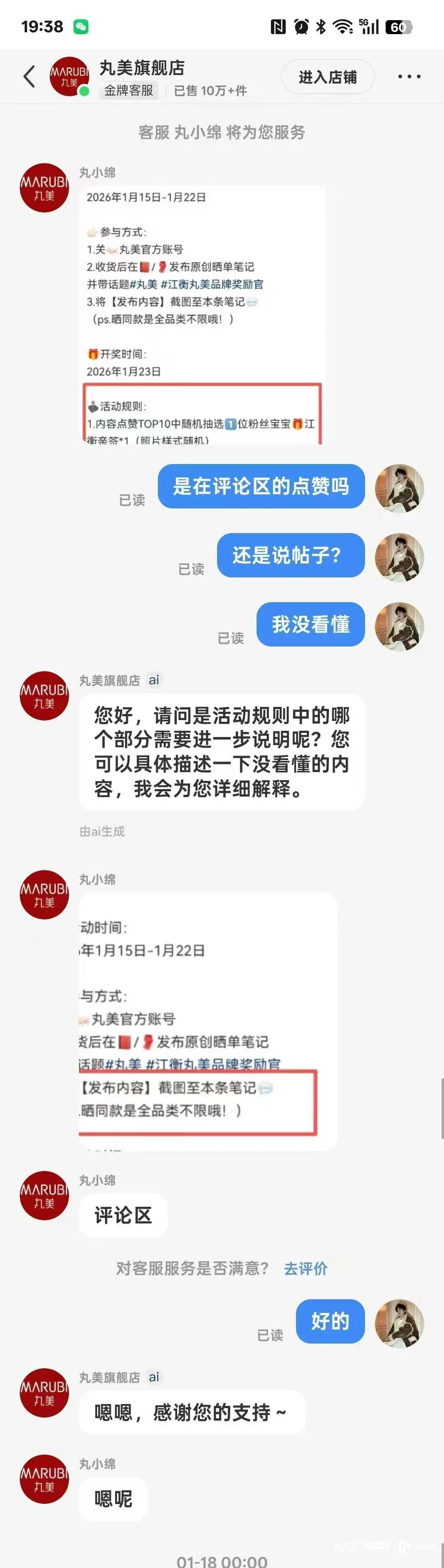 小杨称,活动期间她曾向品牌客服咨询规则,对方明确回复抽奖范围为评论区点赞数排名TOP10。基于这一解释,她为参加活动购买了300余元的丸美产品。然而,开奖后,丸美的品牌客服却表示统计标准为 “消费者发布原帖的点赞数”,而非评论区点赞数,所以她未能进入抽奖范围。